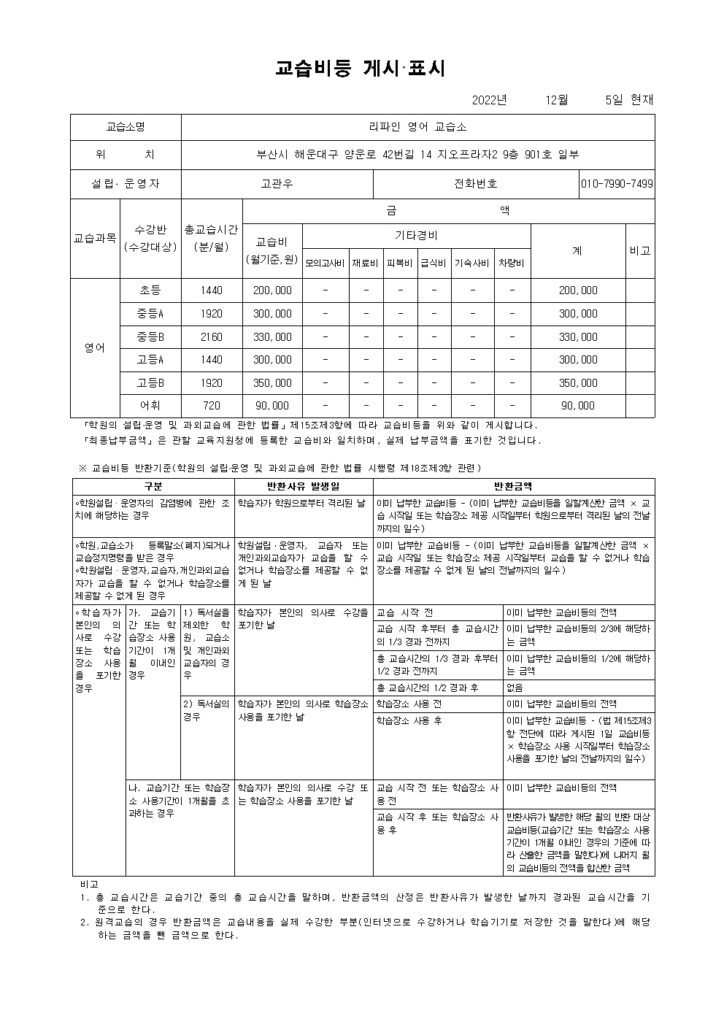 학원 교습비 등 관련 규정에 따른 표시 사항 2025년 10월 21일2025년 10월 21일 IXVV 학원소식 명칭 : 리파인 영어 교습소교습과목 : 영어등록번호 : 제 3787호대표번호 : 010-7990-7499부산광역시 해운대구 양운로42번길 14 지오프라자2 904호